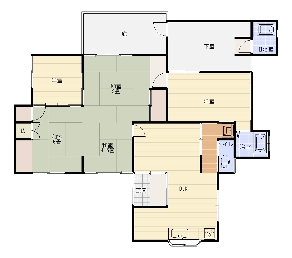 | 間取り | 和室8帖 和室6帖 和室4.5帖 洋室×2 D.K. 浴室 トイレ 下屋 | ||