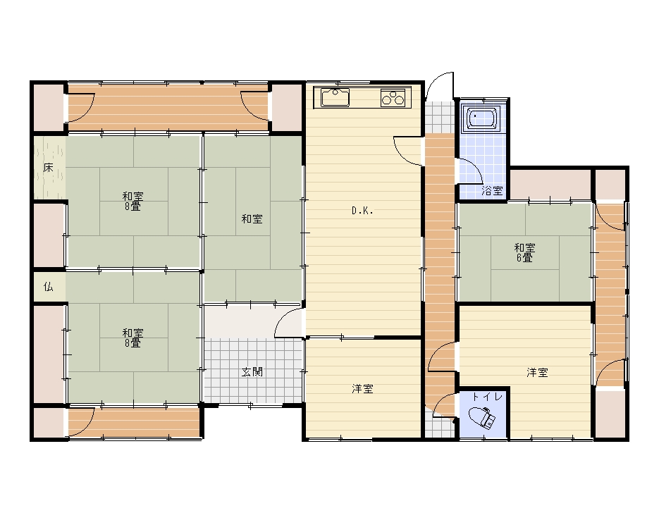 | 間取り | 和室8帖×2 和室7.5帖 和室6帖 洋室×2 D.K. 浴室 浴室 トイレ | ||