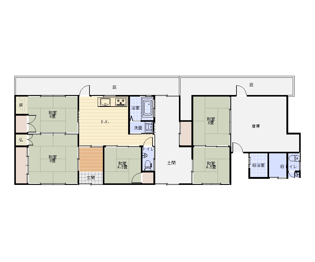 | 間取り | 和室8帖 和室6帖×2 和室4.5帖×2 D.K. 浴室 トイレ 倉庫 土間 | ||
