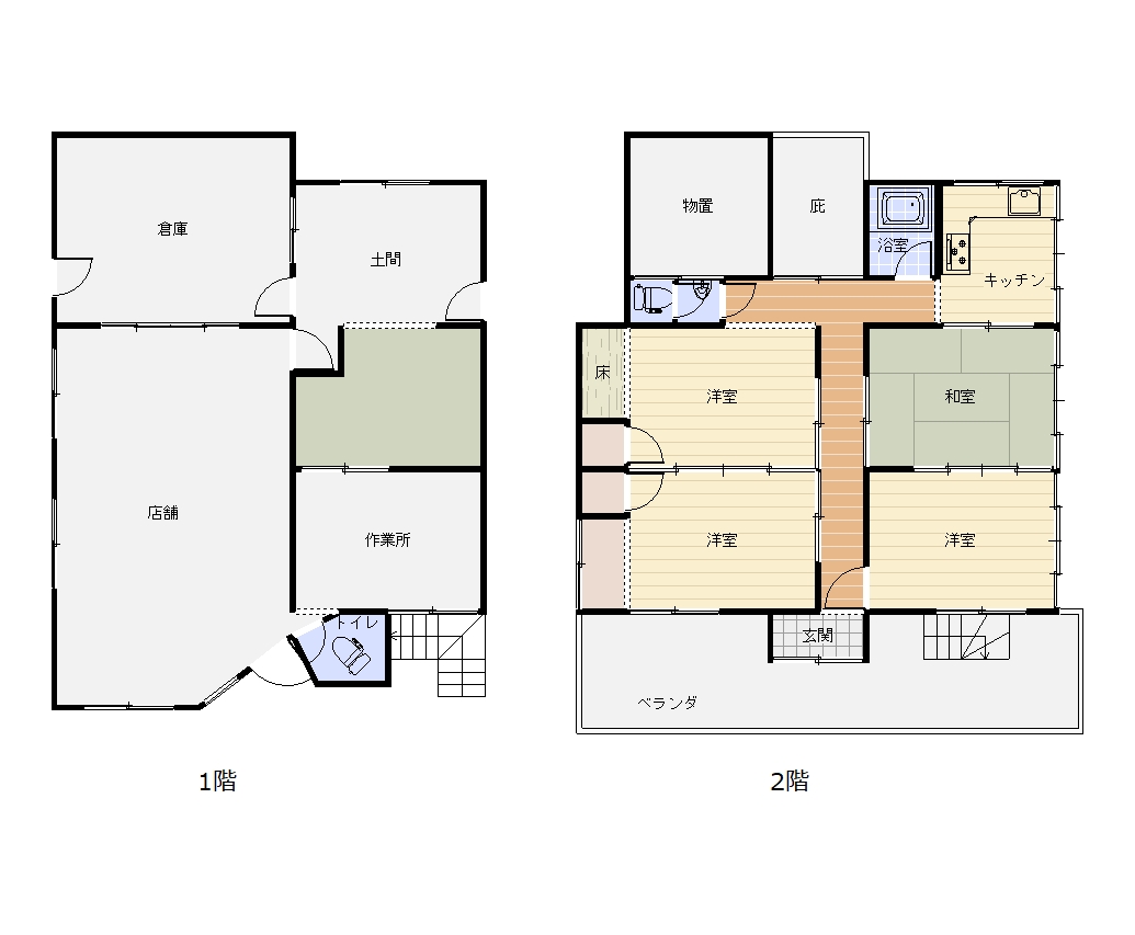 | 間取り | 1階:店舗 作業所 和室 トイレ 倉庫 土間 2階:和室 洋室×3 キッチン 浴室 トイレ 物置 ベランダ |